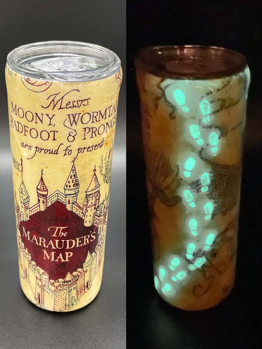Epoxy tumbler with glow in the dark footsteps