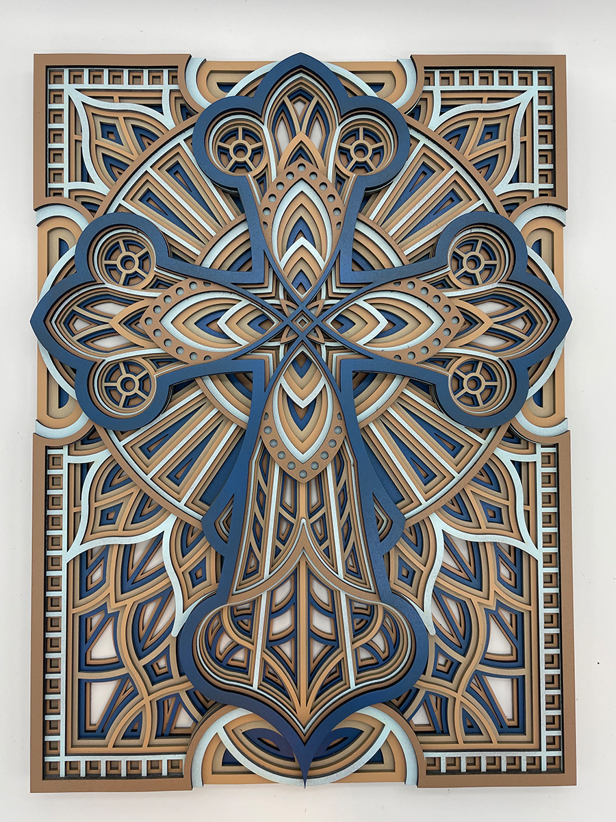 7 layered cross on 3mm board airbrushed with acrylic paint.