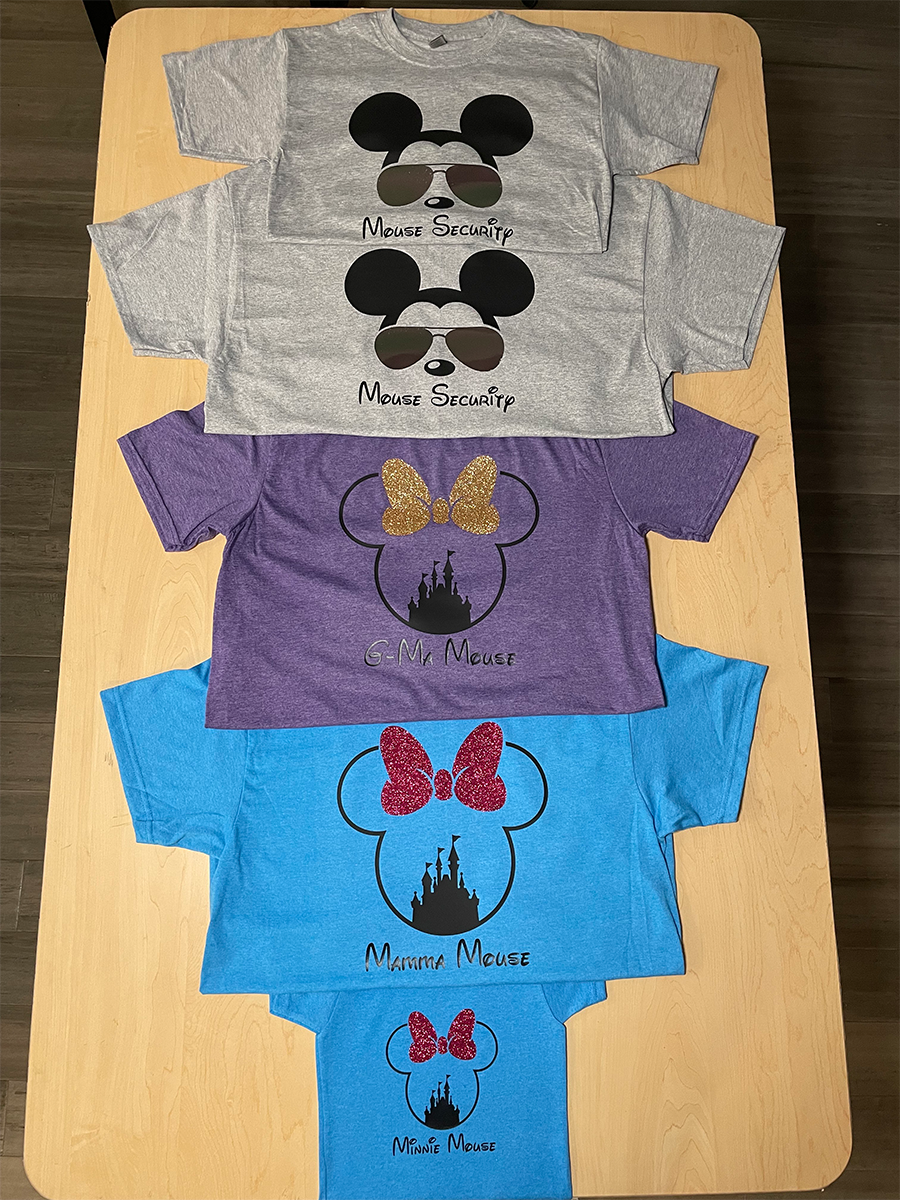 Family vacation vinyl T-shirts with mirrored vinyl on sunglasses.